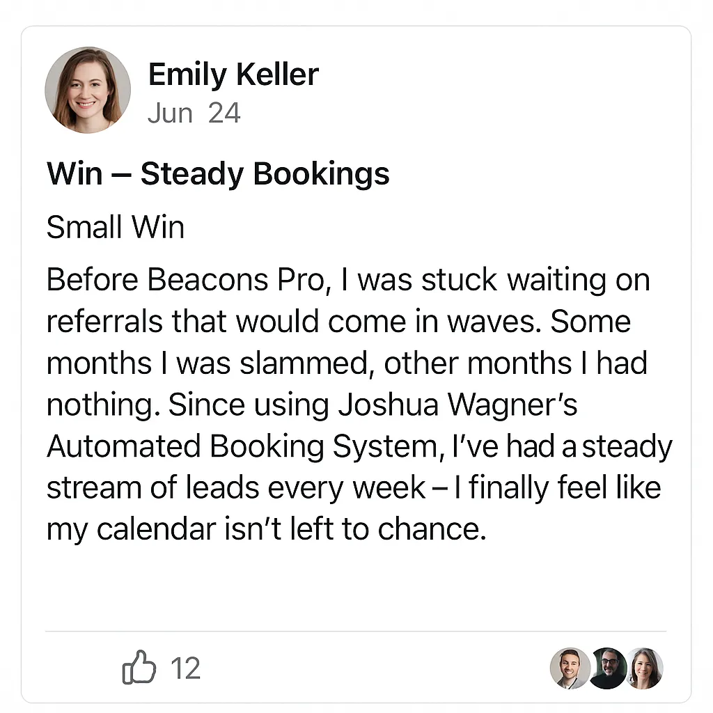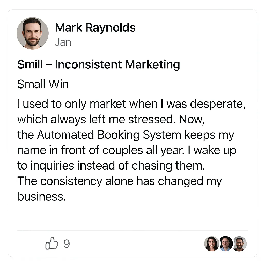 I’ve helped wedding photographers nationwide escape the feast-or-famine cycle by setting up automated systems that bring in consistent leads and bookings.